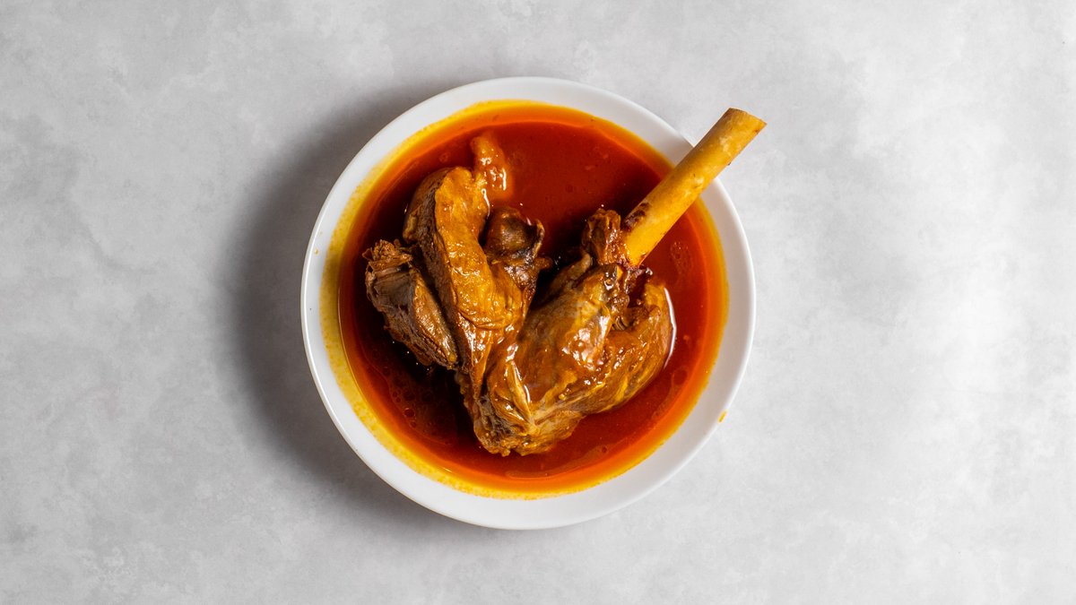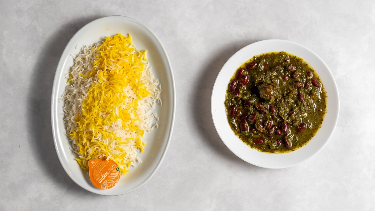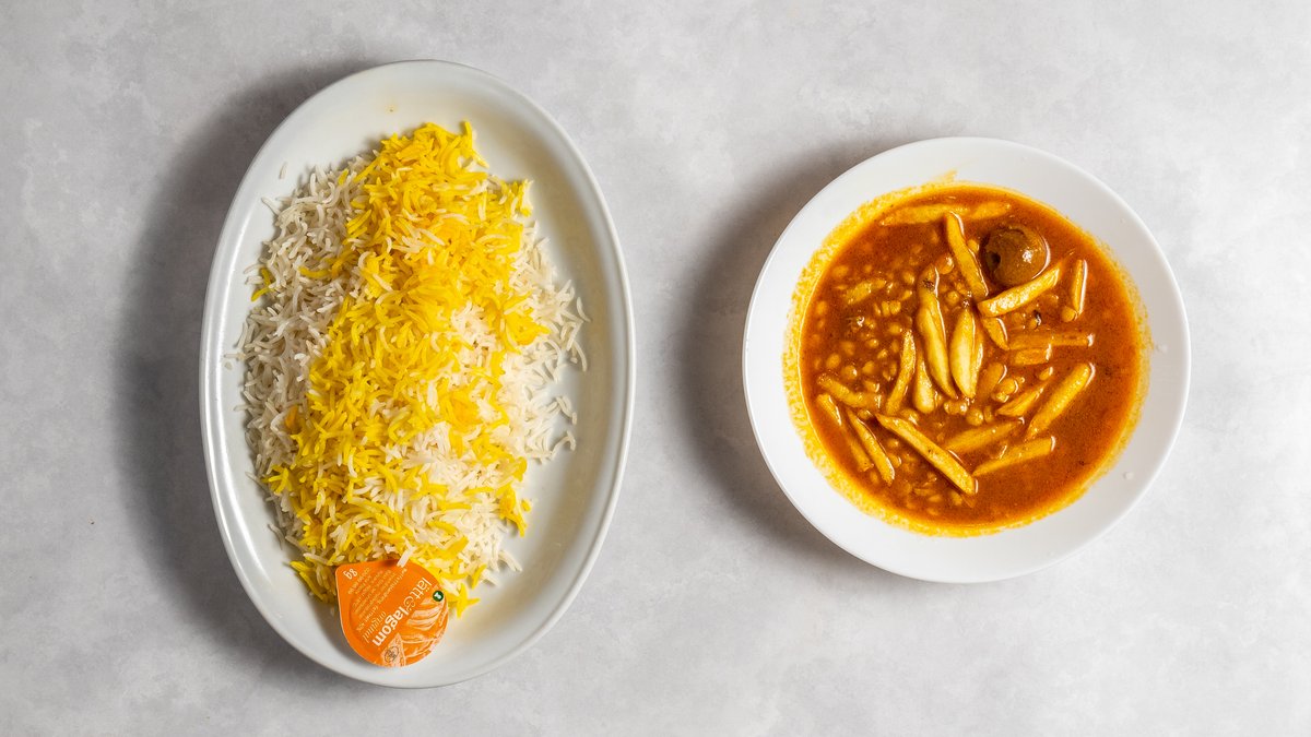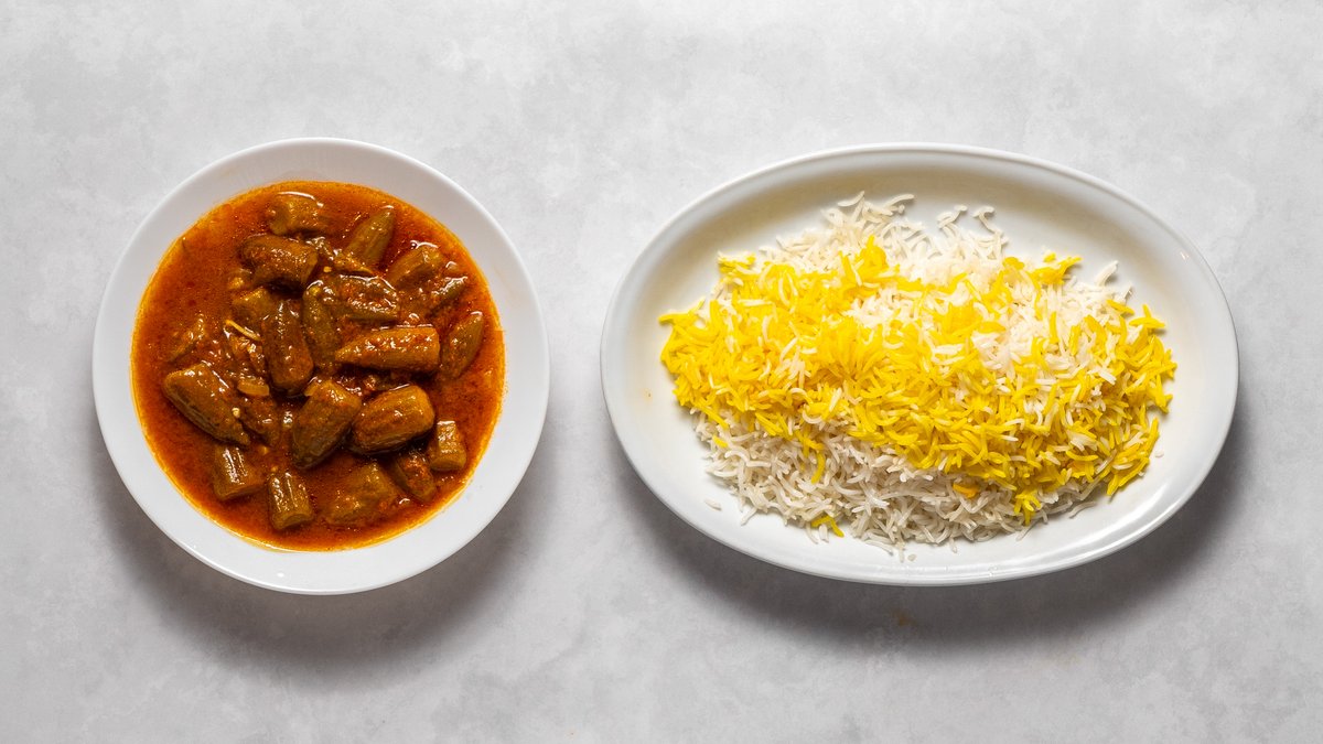 Köttgryta, aubergine, gula linser och lime. Serveras med basmatiris.