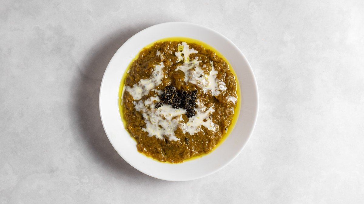 Gula linser, torkad lime och aubergine. Serveras med basmatiris.