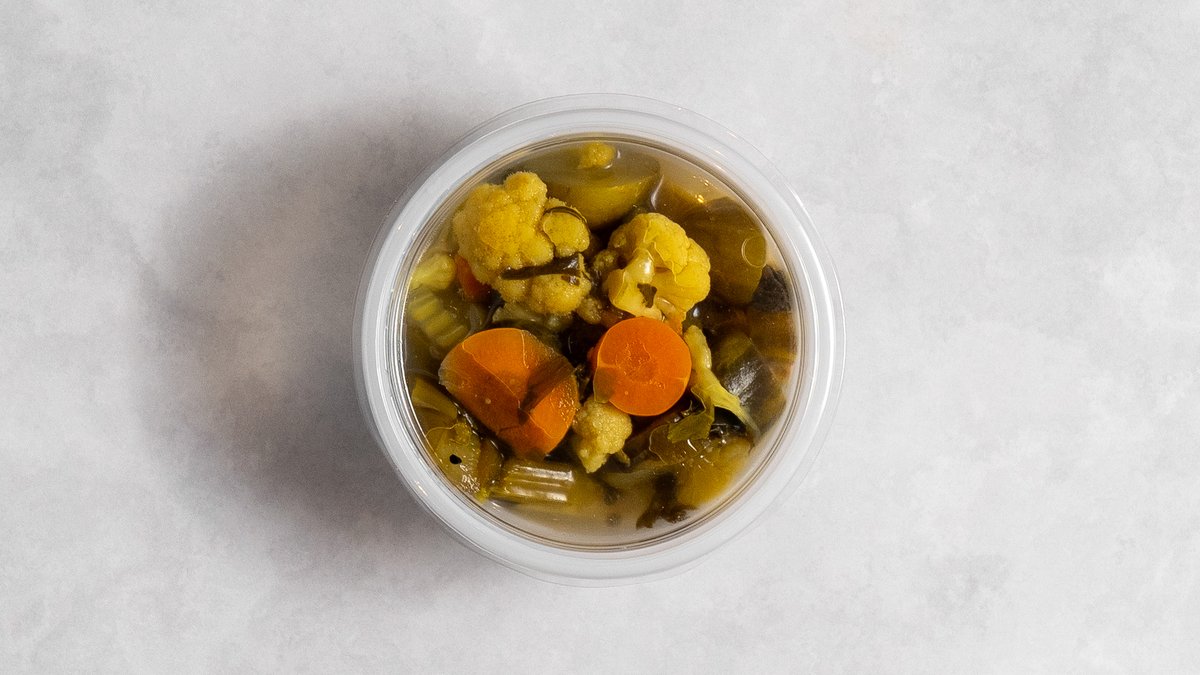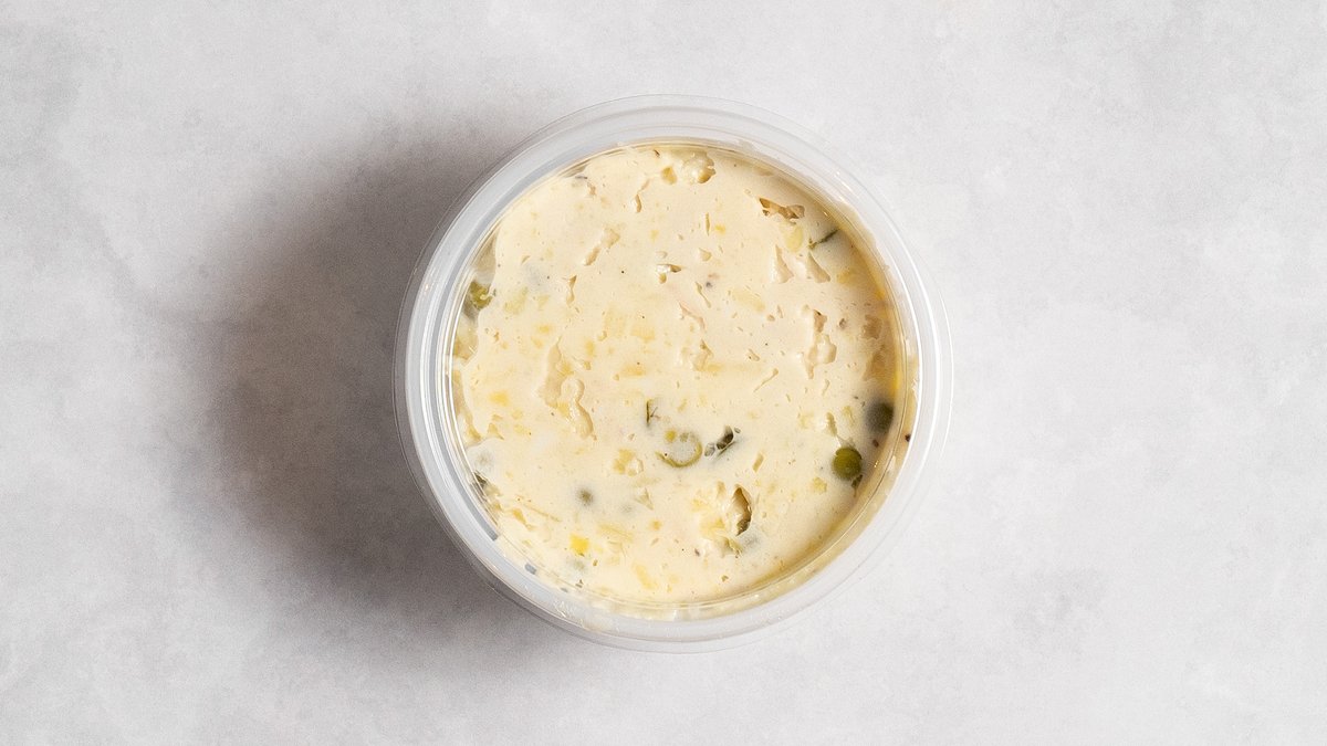 Kyckling, ägg, saltgurka, potatis, majonnäs och gröna ärtor.