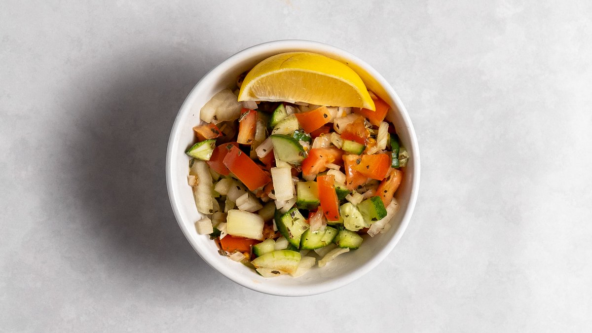 Ryggbiffspett, kebabspett och kycklingspett med grillade tomater, dill, kidneybönor och citron. Serveras med basmatiris.