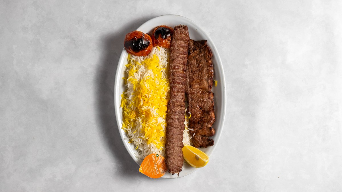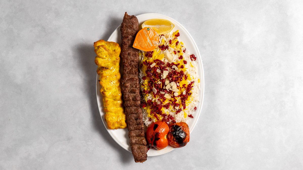 Ryggbiffspett och kycklingspett med grillade tomater, saffran, berberis, mandel och citron. Serveras med basmatiris.