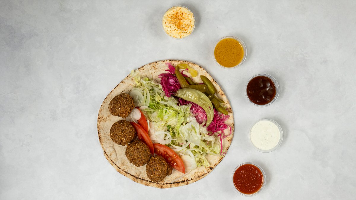 Falafel, sallad, tomat gurka, lök och valfri sås.
