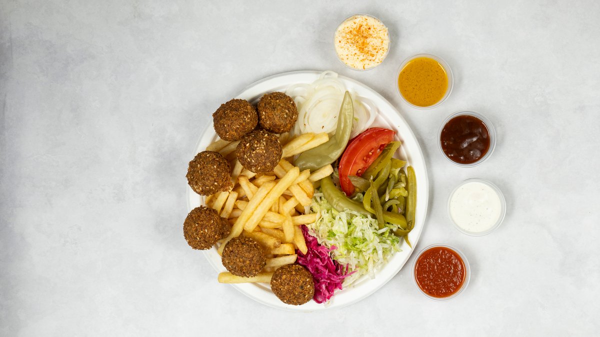 Falafel, sallad, tomat, gurka, lök pommes frites och valfri sås.