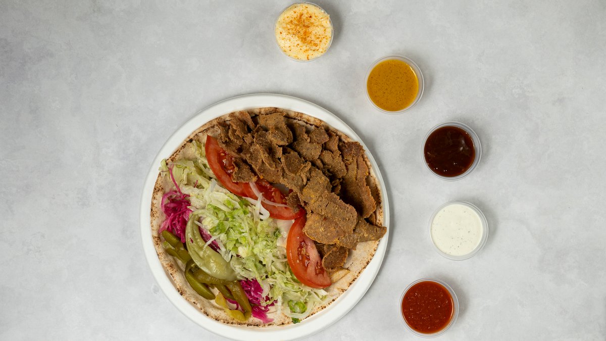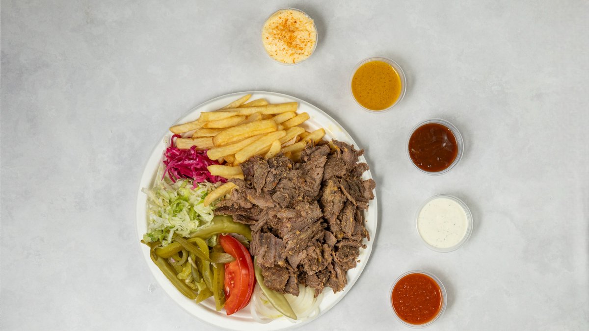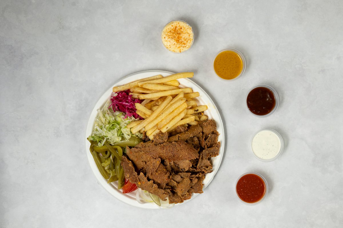 Kebabkött, shawarma, sallad, tomat, gurka, lök, pommes frites och valfri sås.