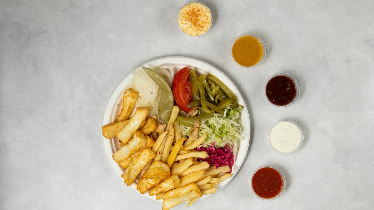 Halloumi, sallad, tomat, gurka, lök pommes frites och valfri sås.