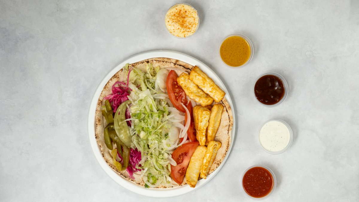 Kyckling, halloumi, sallad, tomat, gurka, lök och valfri sås.
