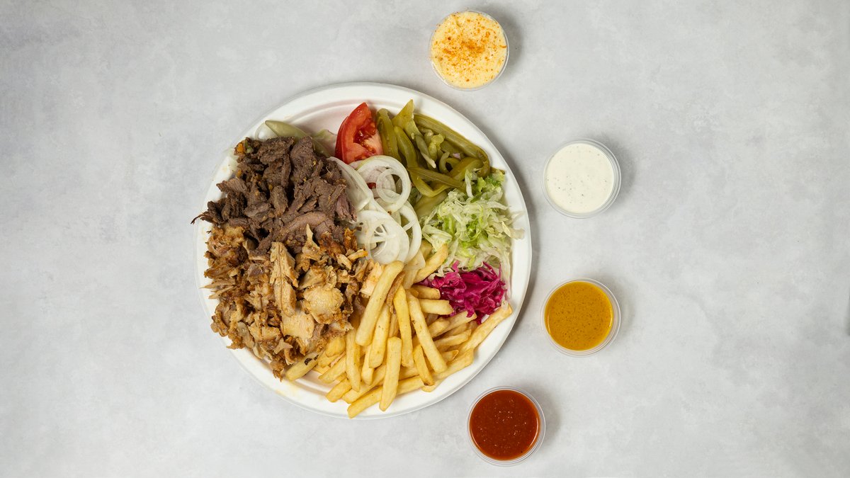 Kebabkött, halloumi, sallad, tomat, gurka, lök, pommes frites och valfri sås.