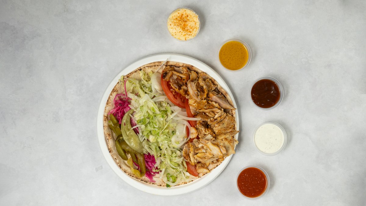 Kyckling, shawarma, sallad, tomat, gurka, lök, pommes frites och valfri sås.