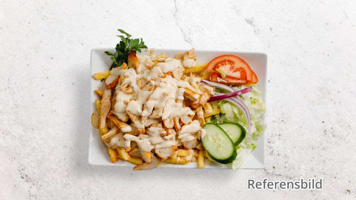 Kyckling med pommes, sallad, tomat, gurka, lök, feferoni och valfri sås.