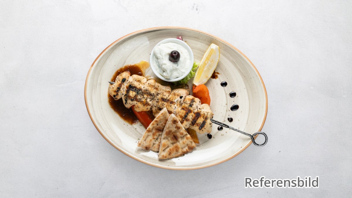 Kycklingkebab, sallad, tomat, gurka, lök, feferoni och valfri sås.
