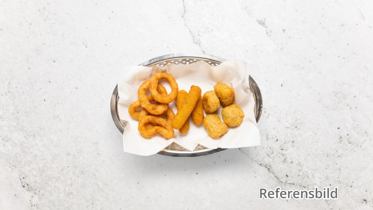 2 st buffalo sticks, 2 st mozzarella sticks, 2 st jalapeño, 2 st lökringar, 2 st kycklingspett, sallad, pommes och valfri sås.