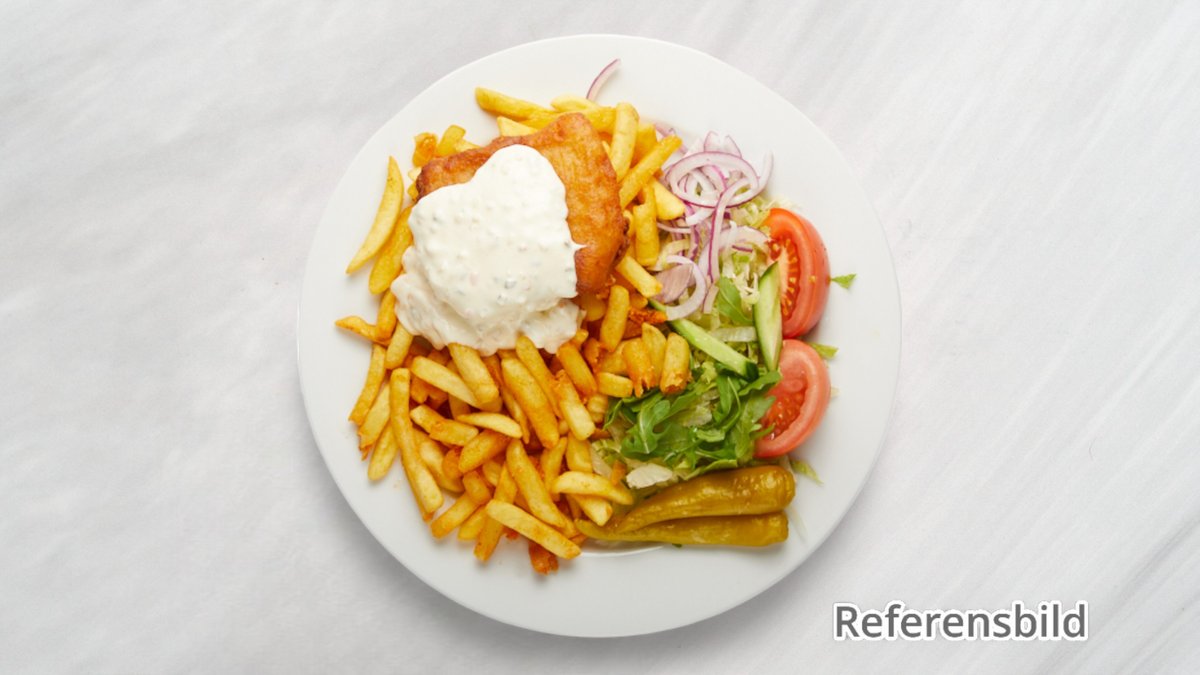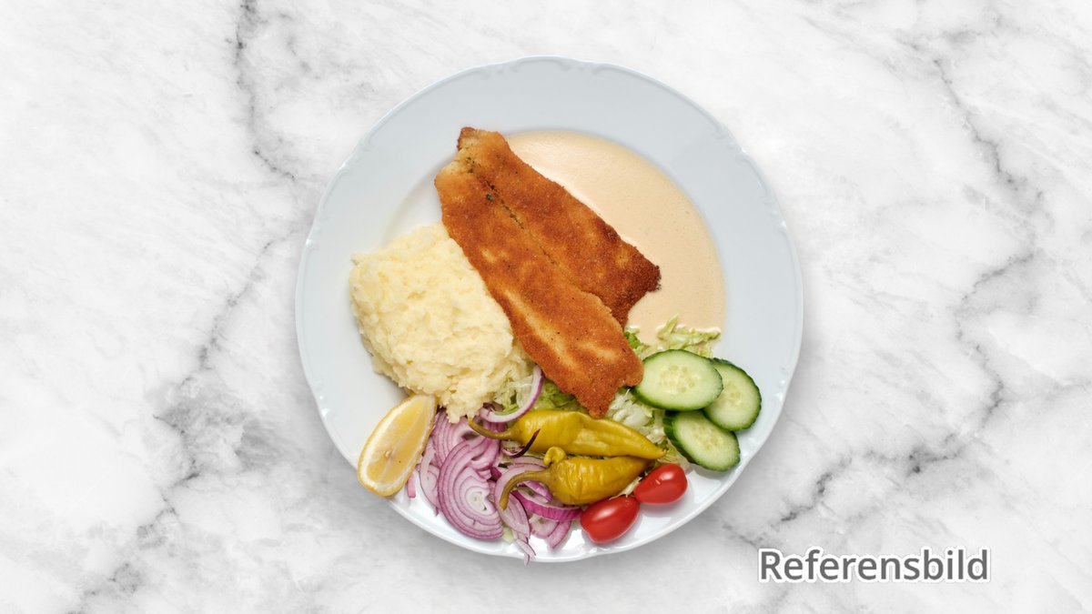 Rödspätta med pommes, sallad, tomat, lök, remouladsås och citron.