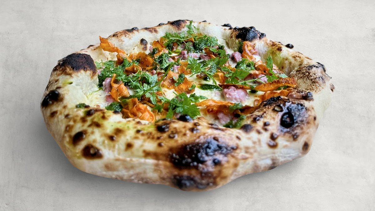 San Marzanotomat, taleggio, vår egna chiliolja, buffemmozzarella, kimchi, parmesan, koriander och rapsfrön.