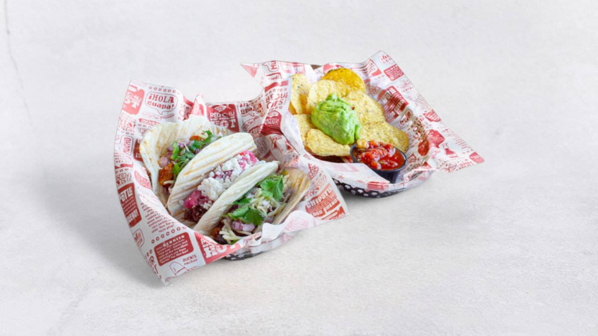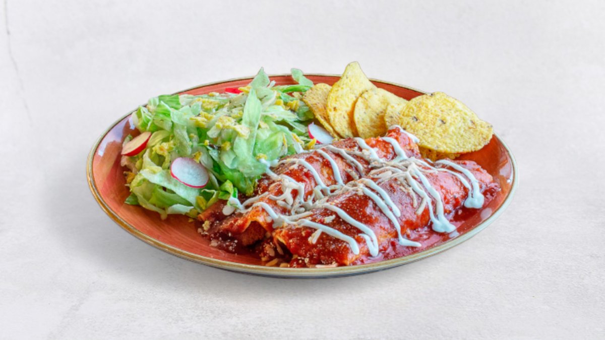Två favoriter: taco och enchilada. Serveras med majschips, valfritt protein, gräddfil, böndipp, hotsås och blandsallad.