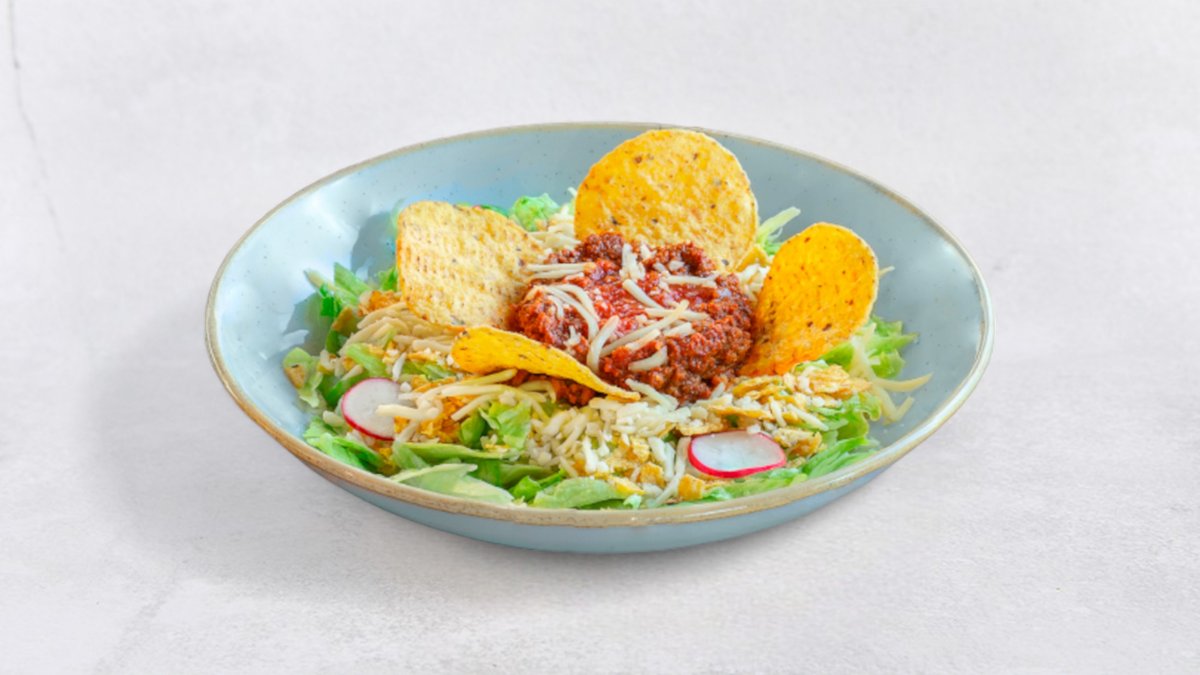 Fräsch sallad med krossade majschips. Serveras med ost, majs, hot-sås, blandsallad och valfritt protein.
