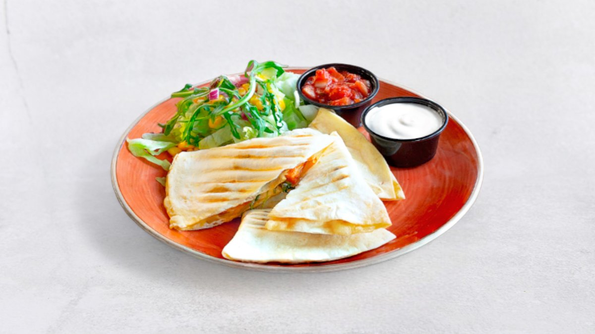 Fyra bitar grillade vetetortillas fyllda med valfri fyllning, ost och ruccola. Serveras med sallad, majschips, gräddfil, salsa och guacamole.