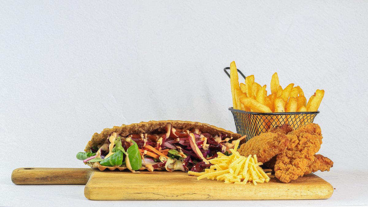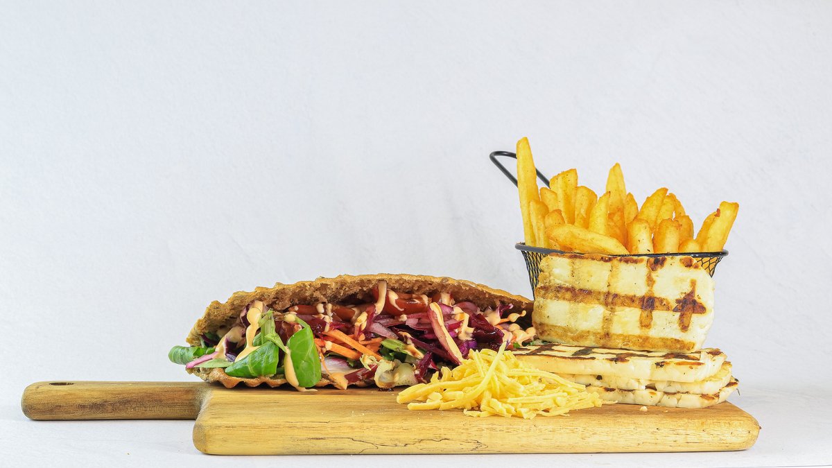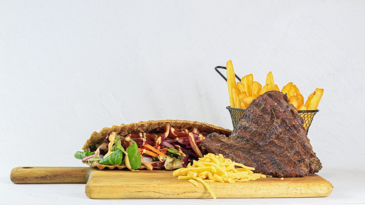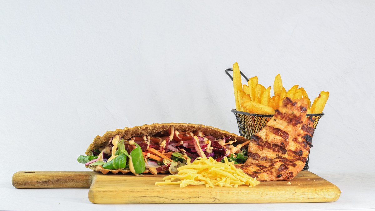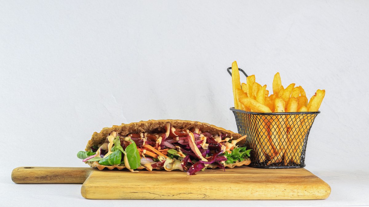 Nybakad pita toppad med sesam och svartkummin. Välj valfri smörjning, grönsaker och dressing i nästa steg.