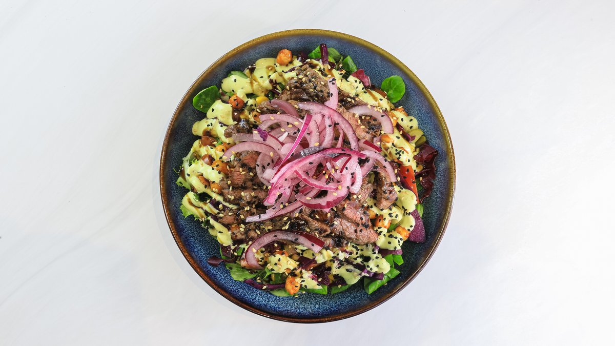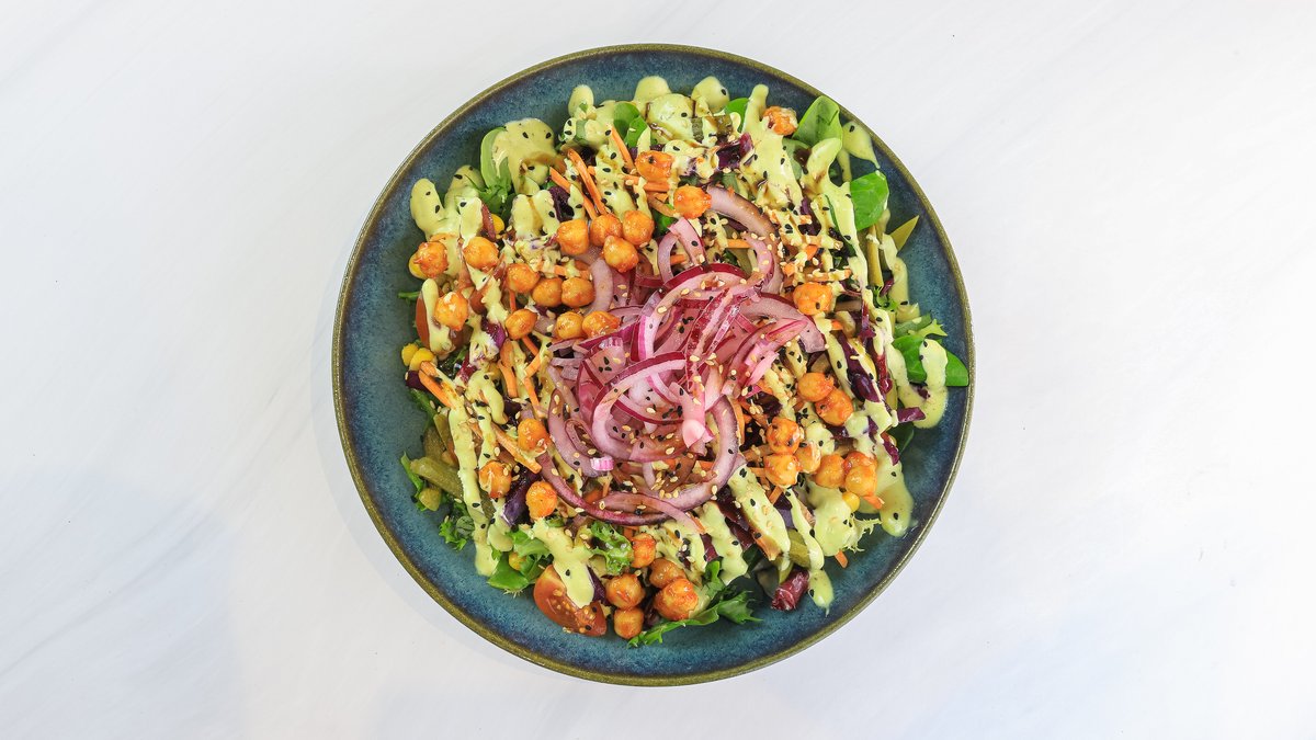 Sallad med knapriga rågbrödskrutonger, frömix och våg egna krydda. Välj valfria grönsaker och valfri dressing i nästa steg.