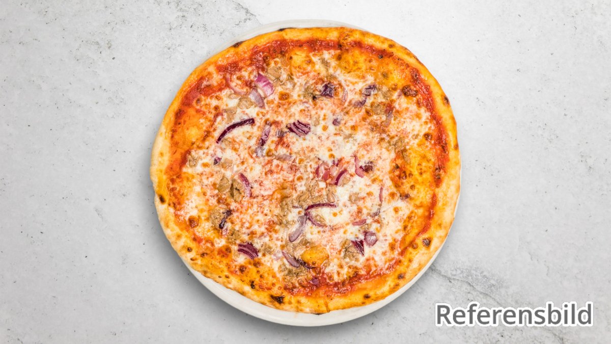 Tomatsås, ost, tonfisk, champinjoner, lök och paprika.