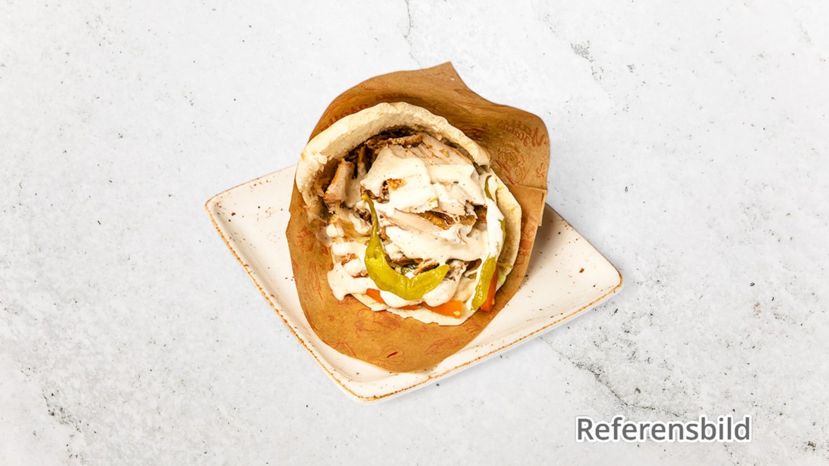 Tomatsås, ost, vitlökssås, isbergssallad, gurka, tomater, kebabkött (nötkött) och feferoni.