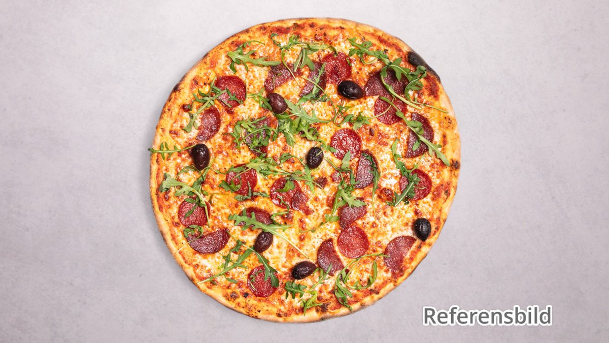 Tomatsås, ost, skinka, räkor, champinjoner, paprika och svartpeppar.