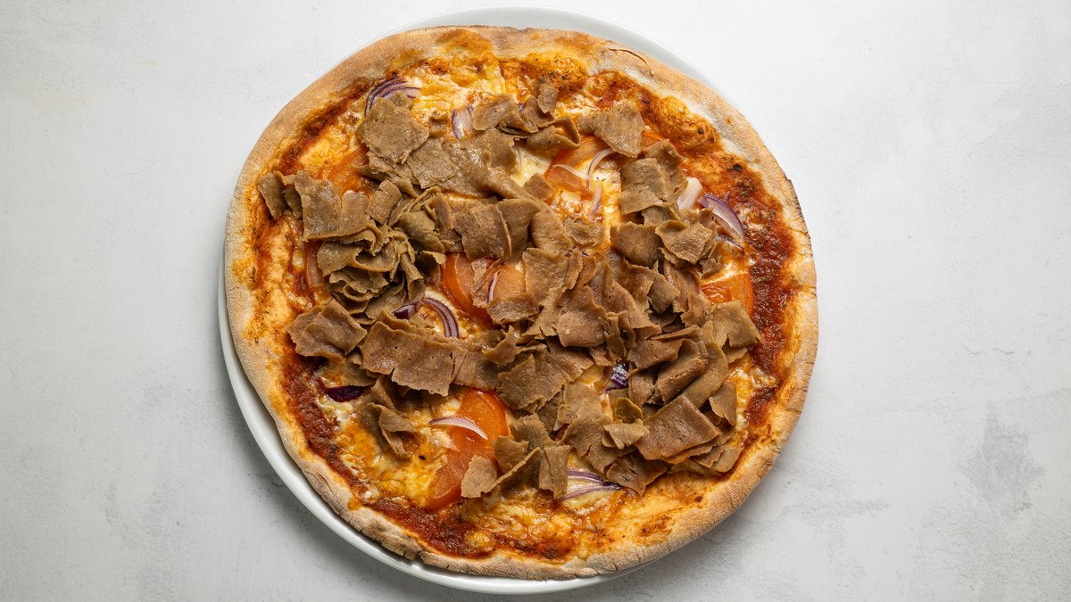 Tomatsås, ost, tomater, kebabkött, kebabsås, lök och peperoni.