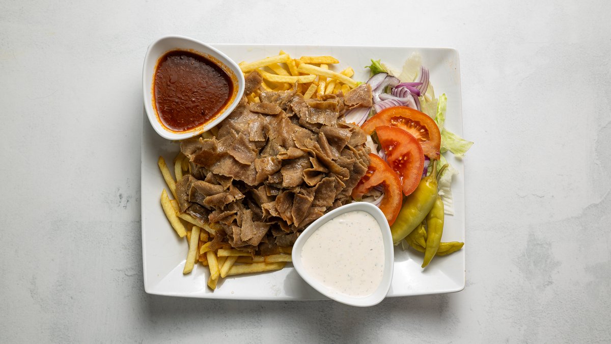 Tomatsås, ost, champinjoner, kebabkött, blandsås och pommes.