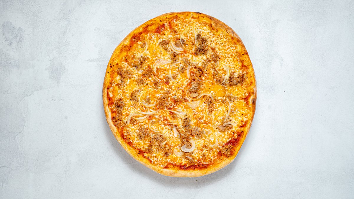 Tomatsås, ost, tonfisk och lök.