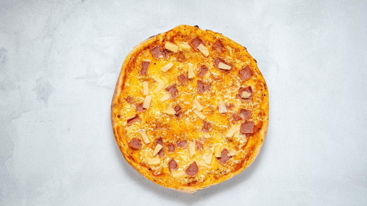 Tomatsås, ost, skinka och ananas.