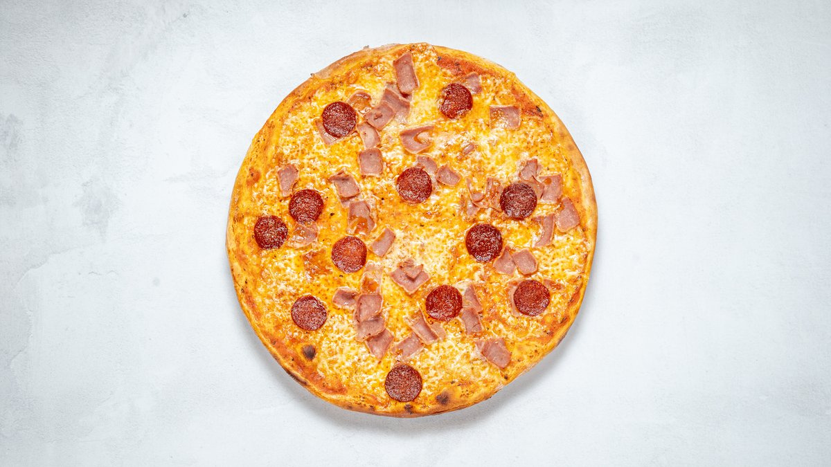 Tomatsås, ost, skinka och pepperonikorv.