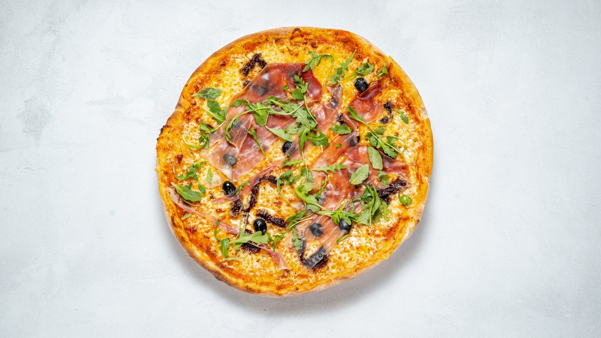 Tomatsås, ost, parmaskinka, mozzarellaost, tomater (soltorkade), oliver, ruccolasallad och parmesanost.