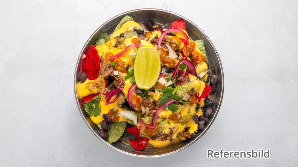 Doritos chips, cheddarsås, jalapeños och rödlök.