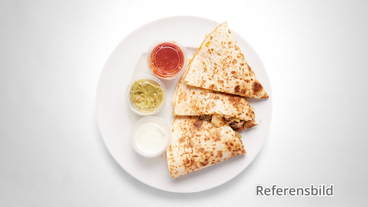 Tortillabröd, mozzarellamix och jalapeños. Välj protein och 2 st valfria dippsåser i nästa steg.