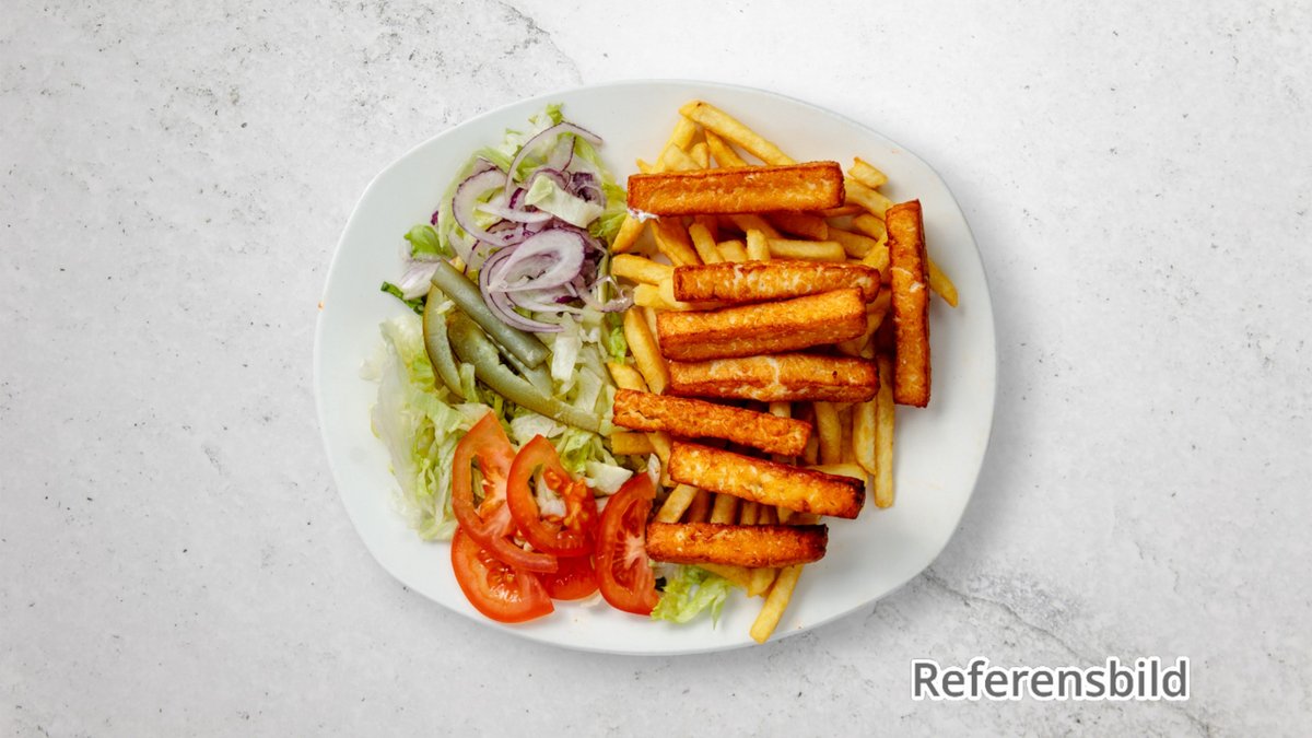 Salladsmix, hummus, rödkål och persilja. Serveras med pommes. Välj Protein i nästa steg.