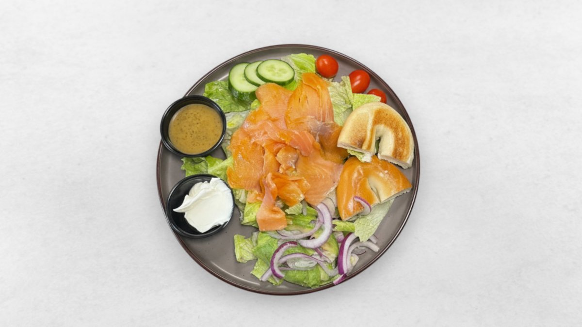 Kallrökt lax, färskost, tomat, gurka och rödlök.