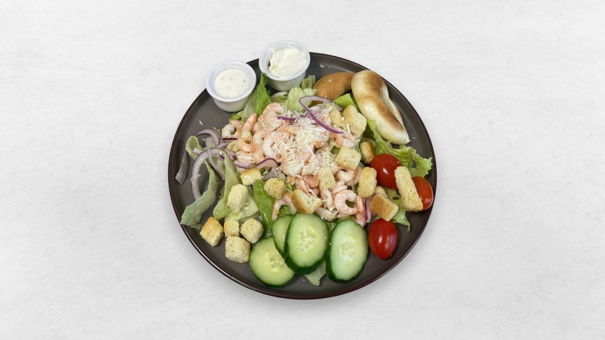 Handskalade räkor, grana padano, ceasar dressing, sallad, tomat, gurka och rödlök.
