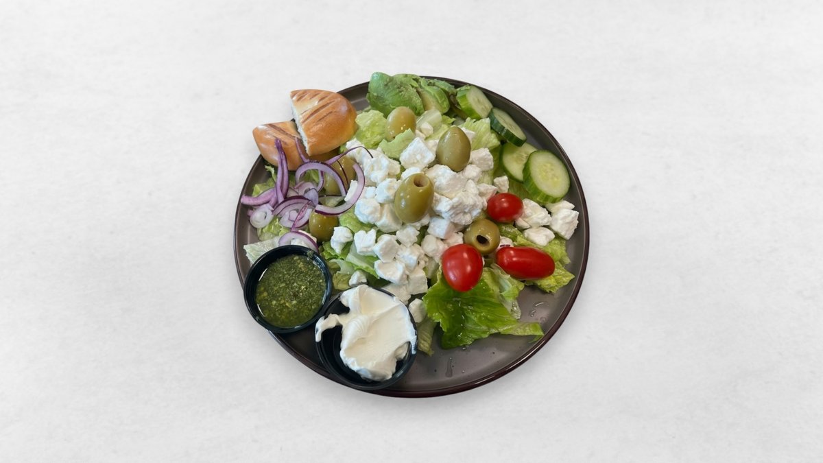 Fårost, avokado, oliver, sallad, tomat, soltorkade tomater, gurka och rödlök.