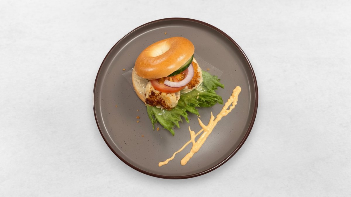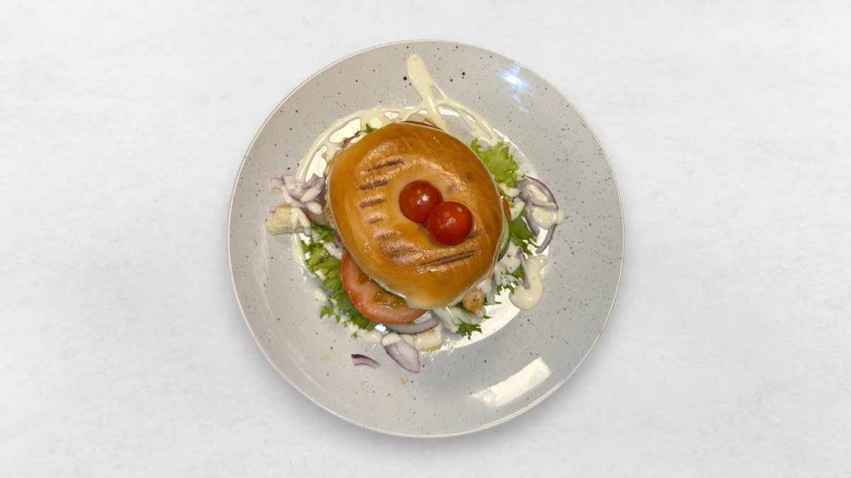 Vegansk kycklingburgare, sallad, tomat, gurka, rödlök, lök, vegansk dressing och vegansk färskost.