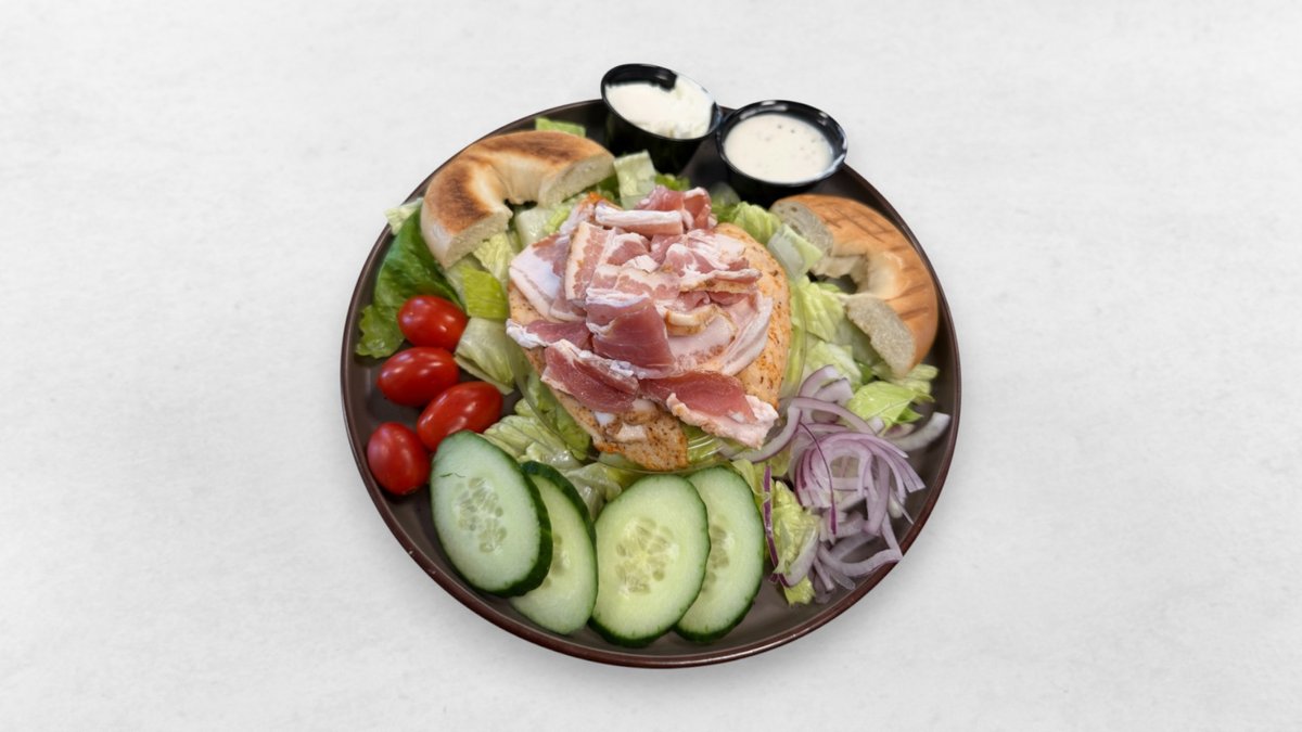 Grillad kyckling, bacon, ceasar dressing, Grana Padano, sallad, tomat, gurka och rödlök.