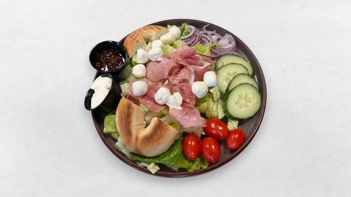 Lufttorkad skinka, mozzarella, färskost med soltorkade tomater, tomat, gurka och rödlök.