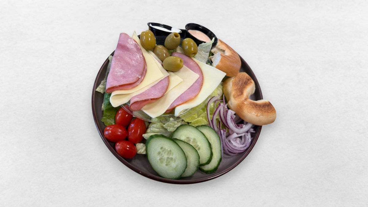 Ost, rökt skinka, sallad, tomat, gurka, oliver och rödlök.