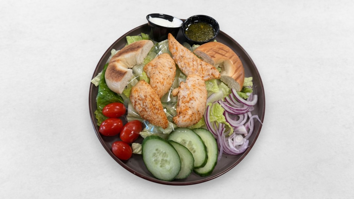Panerad kyckling, chilimajonnäs, kalkon färskost, sallad, tomat, gurka och rödlök.
