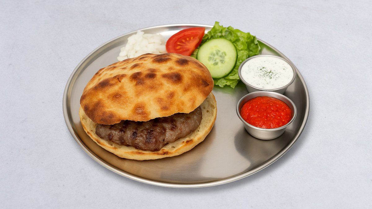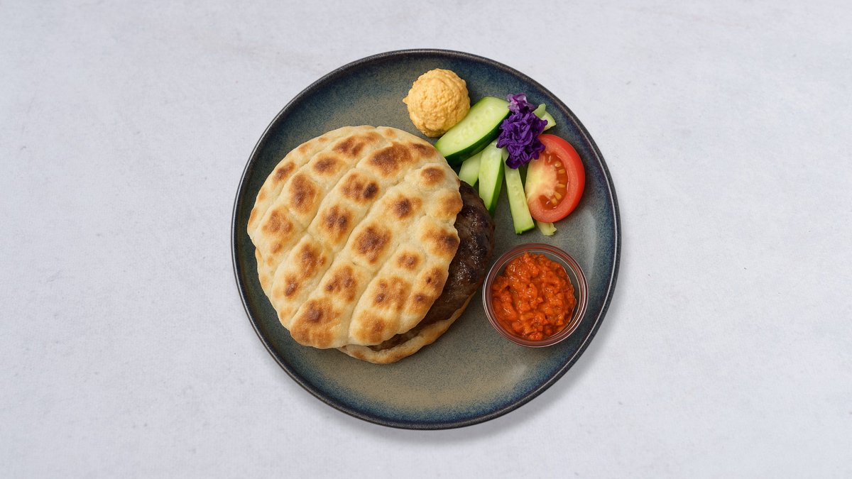 En stor, saftig köttfärsbiff gjord av nötfärs, smaksatt med vitlök och örter. Serveras traditionellt med lök, ajvar och lepinja.