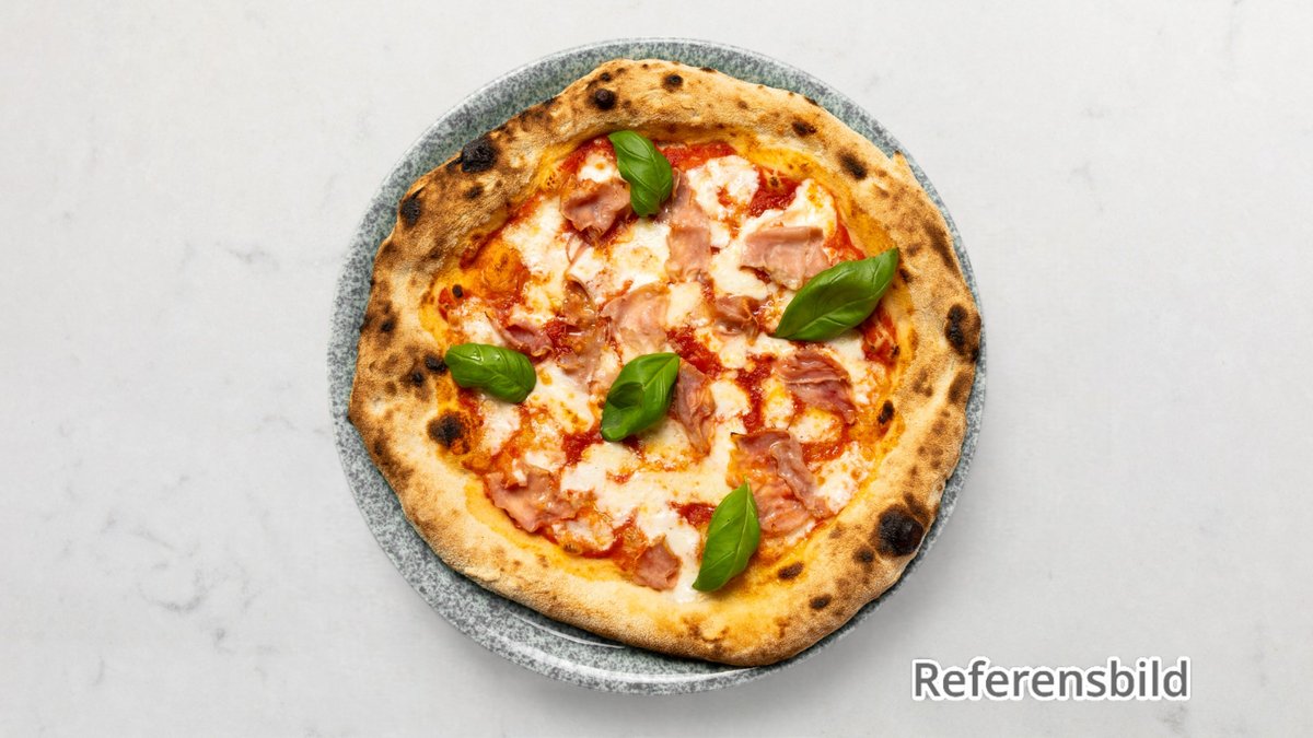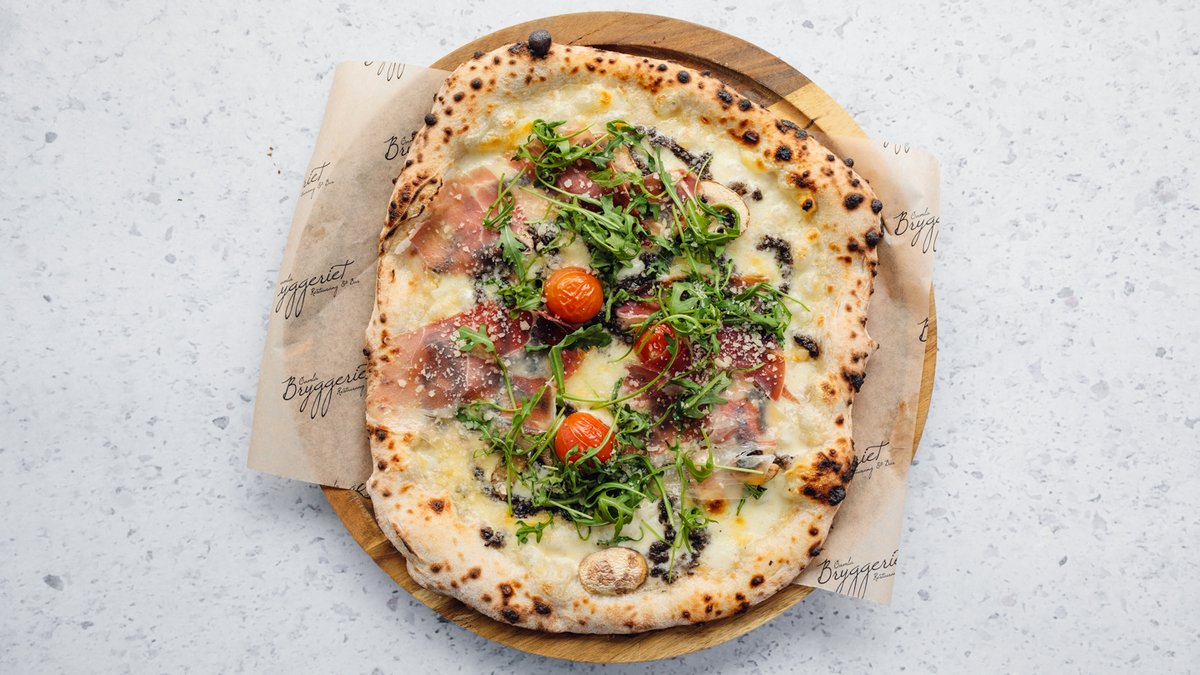 Tomatsås, mozzarella, tryffelkräm, champinjon, cocktailtomat, lufttorkad skinka och ruccola.