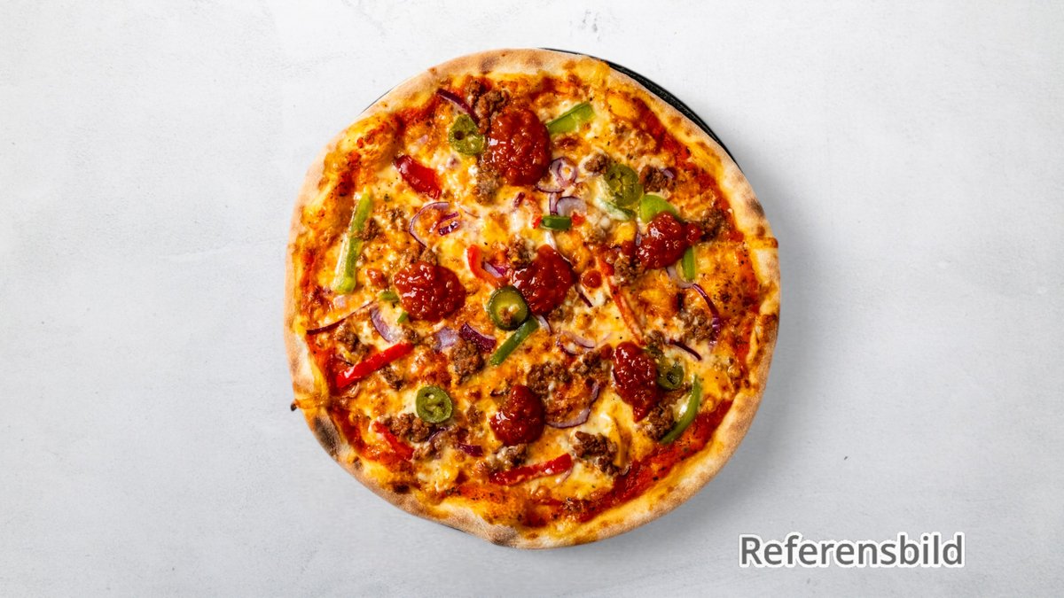 Tomatsås, ost, lök, bacon, salami och köttfärs.