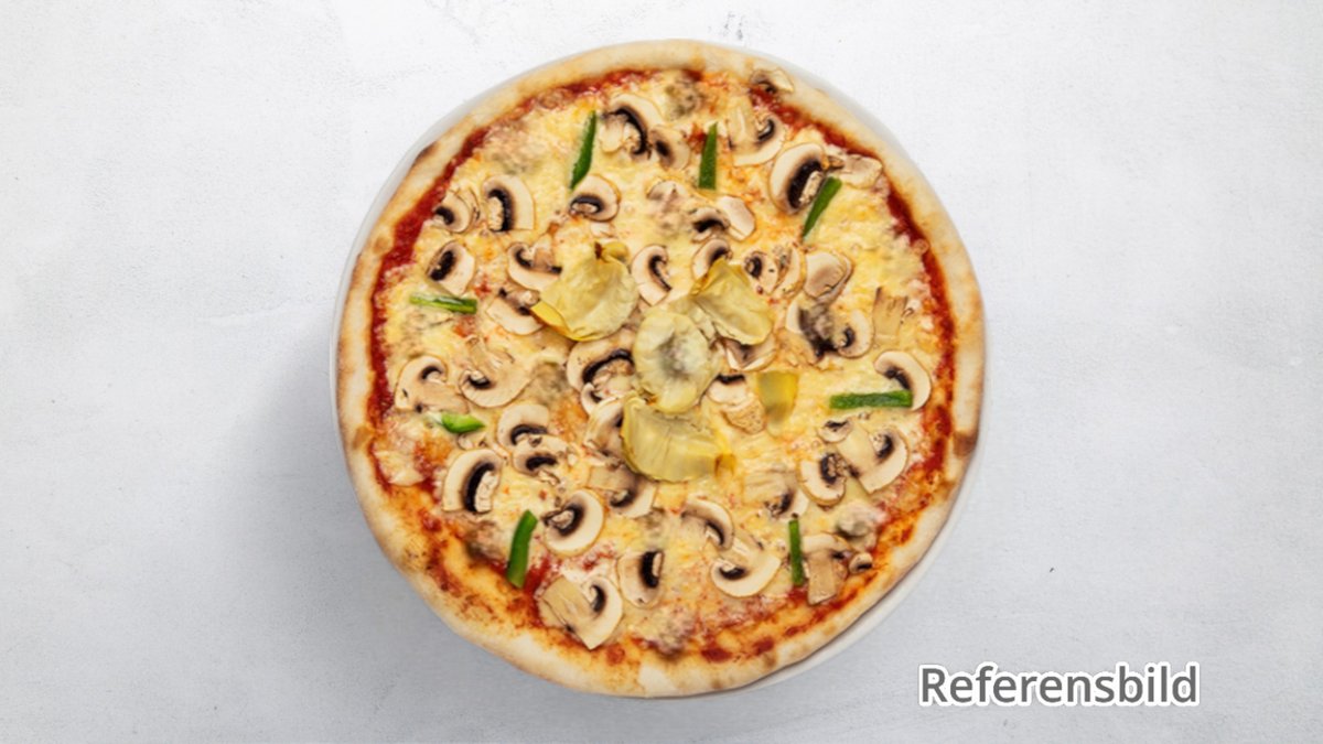 Tomatsås, ost, skinka, champinjoner, fetaost, oliver och ruccola.