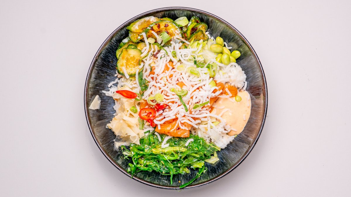 Ris, gurksallad, sriracha, majonnäs, sjögräs, sojabönor, sesam, böngroddar och ingefära.