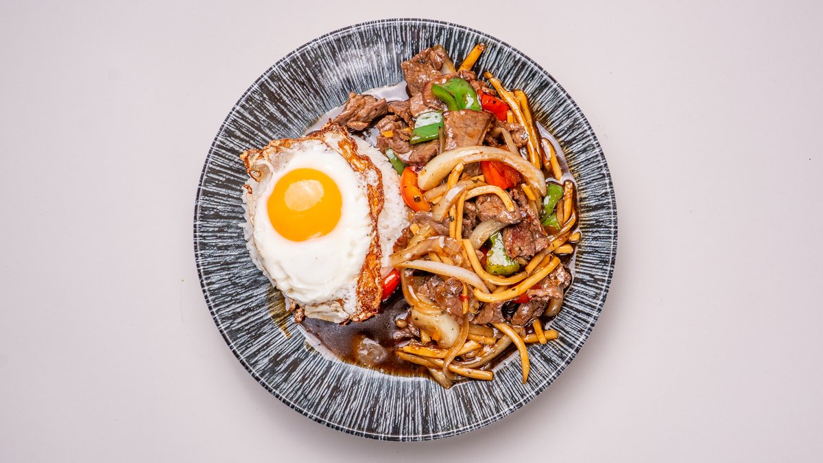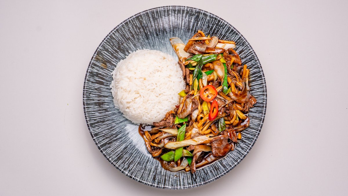Biff, ägg, bambuskott, lök, paprika och stark basilika.