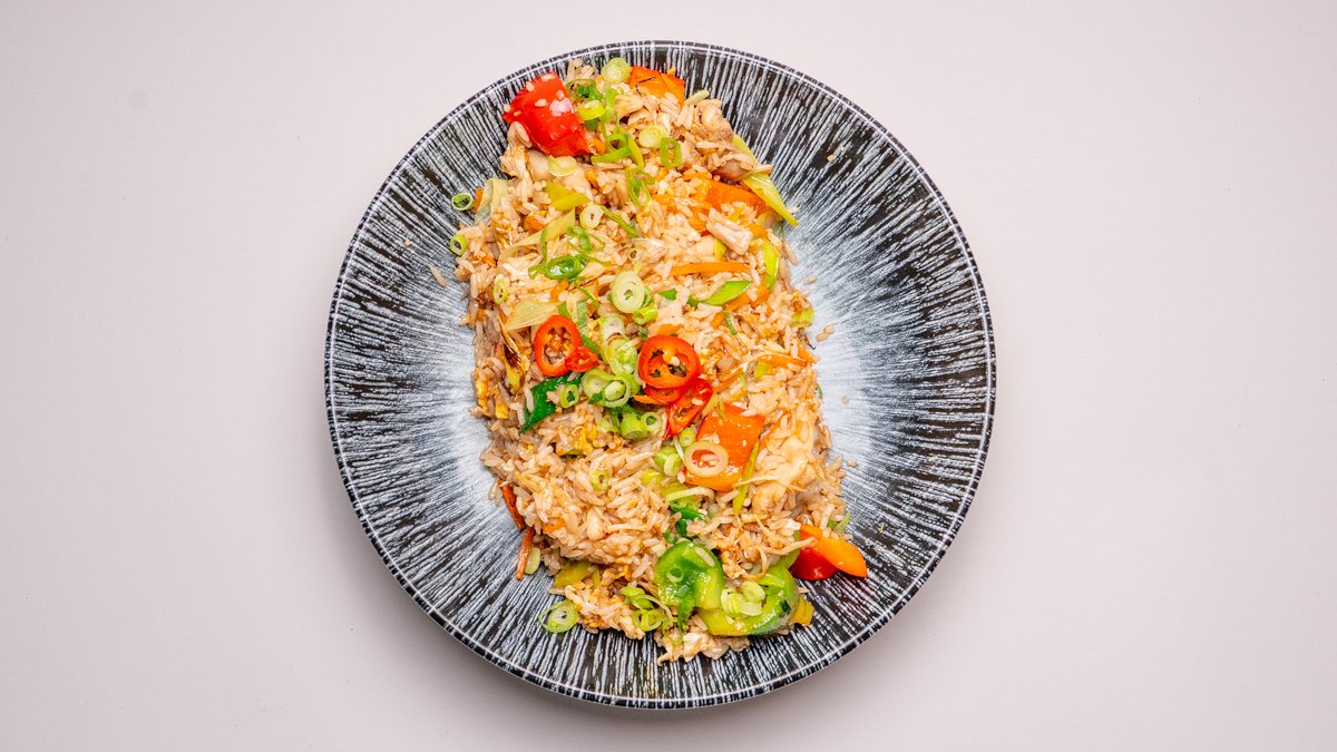 Kyckling eller tofu, ägg, morot, lök och paprika.