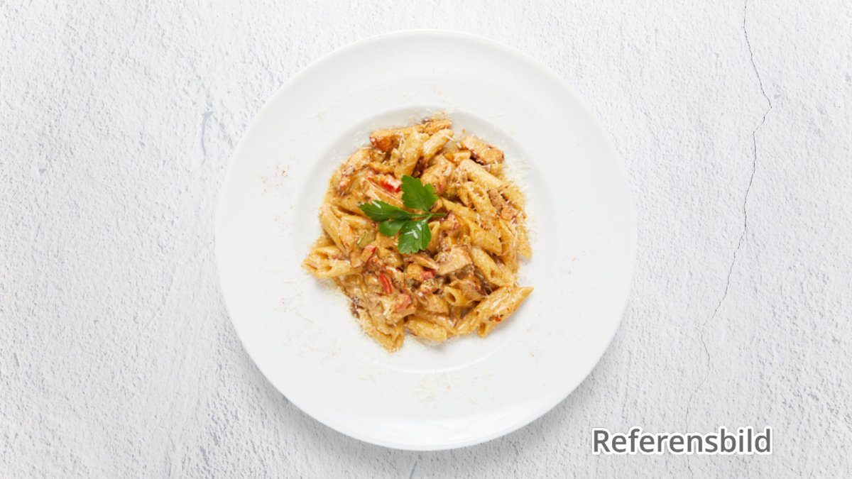 Inbakad. Tomatsås, ost, skinka och räkor.